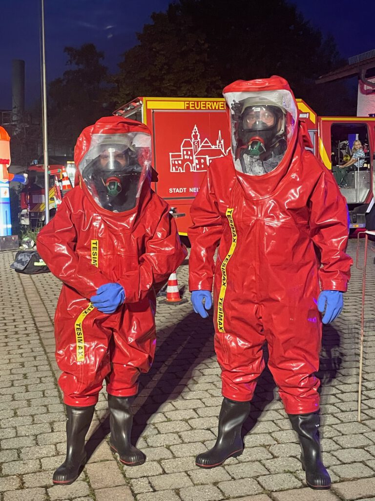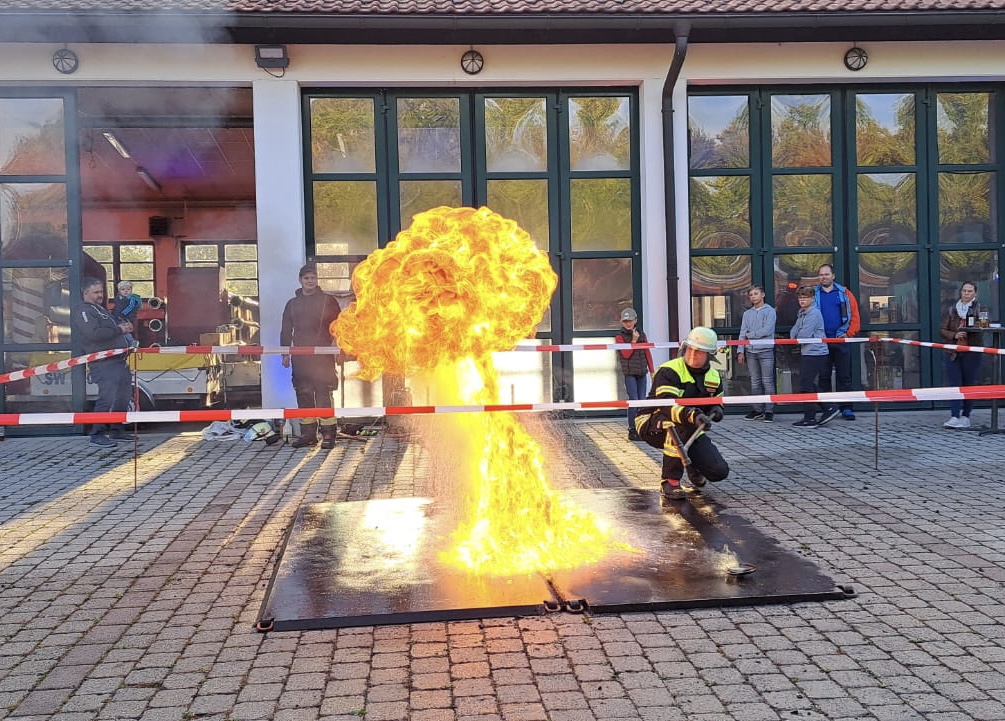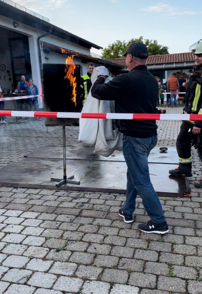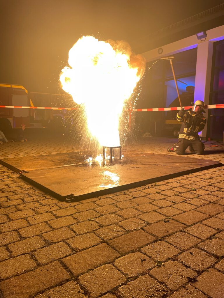 Des Weiteren haben wir auch Übungseinsätze abgehalten, die von unserem ersten Kommandanten Tobias Wegner kommentiert wurden. Wer sich den ganzen Abend Zeit genommen hatte, konnte mehrere Fettexplosionen sehen, eine Löschdecke an einem brennenden Übungsobjekt testen und eine Löschübung unserer Jugend, einen THL-Übungseinsatz unserer Aktiven und eine Vorführung vom ABC-Schutzanzug anschauen.